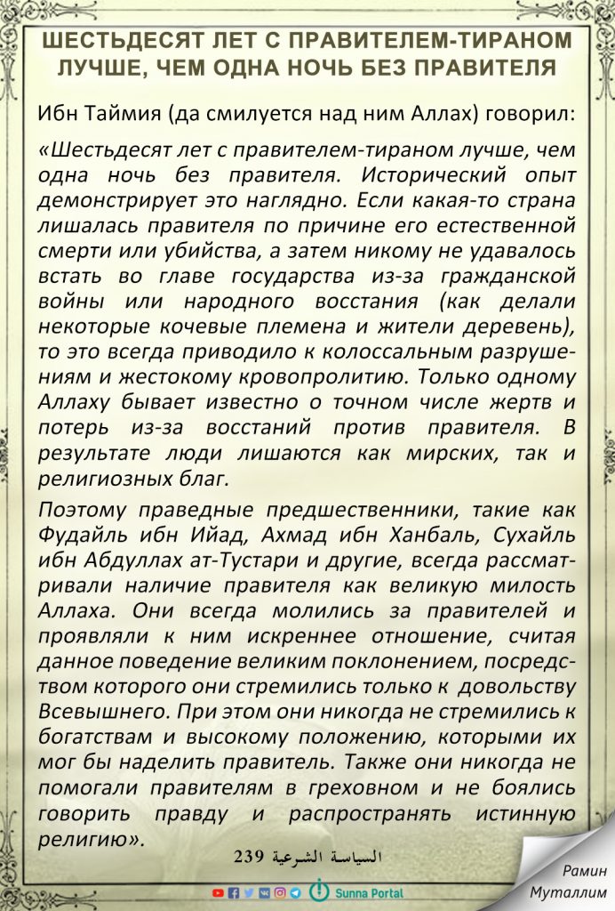 «Шестьдесят лет с правителем-тираном лучше, чем одна ночь без правителя. Исторический опыт демонстрирует это наглядно. Если какая-та страна лишалась правителя по причине его естественной смерти или убийства, а затем никому не удавалось встать во главе государства из-за гражданской войны или народного восстания (как делали некоторые кочевые племена и жители деревень), то это всегда приводило к колоссальным разрушениям и жестокому кровопролитию. Только одному Аллаху бывает известно о точном числе жертв и потерь из-за восстаний против правителя. В результате люди лишаются как мирских, так и религиозных благ.